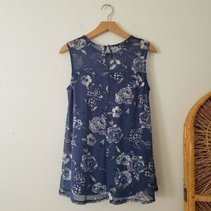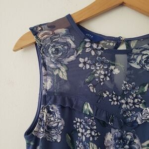Apt. 9 Blue Floral Sleeveless Blouse Illusion Neckline Mesh Overlay S