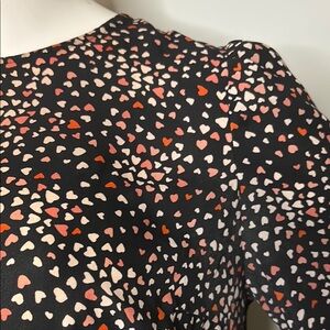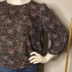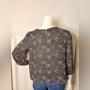 This Apt. 9 blouse features a relaxed fit with a round neckline and 3/4 sleeves. The brown fabric is adorned with a delicate white dotted pattern, offering a stylish and versatile look for any occasion.