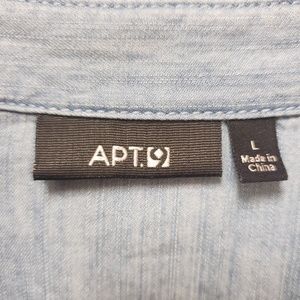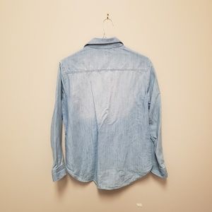 This stylish shirt has been worn only a few times but is still in great condition. It is light blue and slightly white in color and has a small upper breast pocket on the left side. It is long sleeved and also has a collar with rhinestones decorating it. It has 7 buttons going down and has one button on each end of the sleeve.