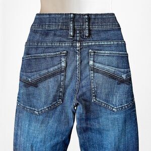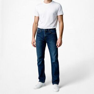 Men's jeans. Fitted low rise and straight leg boyfriend style on women. Zip and button closure. Five pockets. Straight cut. New without tags