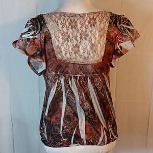 This rust colored with silver studs flutter sleeve with lace back top is a size Small with a pit to pit measuring 19" and a length of 23". In excellent condition. Offers are welcome.