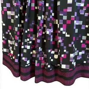 This is an Apt 9 dress in a size large. I purchased this dress in 2010. I've only worn it a couple of times. It is black with white and purple shades of a block design. The last two photos are closer to the actual color. 96% polyester 4% spandex.
