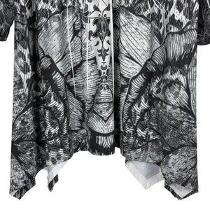 Apt. 9 Graphic Print Tunic Top 2X Sheer Lace Detail Black White Shark Bite Hem
