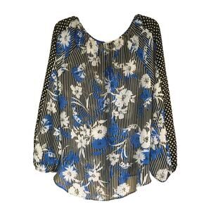 Apt. 9 large tie front long sleeve scoop neck High-lo sheer blouseBlack and white stripes with blue and white floral Black and white polkadot stripe on outside of the sleeve