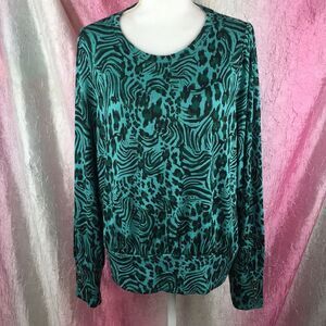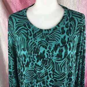 Turquoise with black animal print on this very lightweight, rayon/polyester/spandex sweater. Love the banded waistline and the accent buttons on the cuffs. The brand is Apt 9 and it is a size XL. Bundle with other items in my closet for a money saving offer. Fast shipping! 📦📫