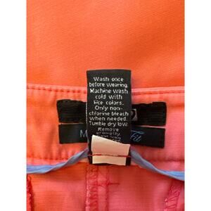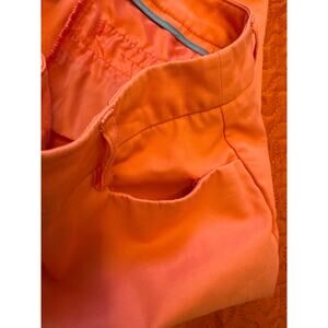 Coral/tangerine in color. Faux pockets in the back. Waist laying flat 18 inches, rise 9 1/2 inches, inseam 18 inches. in excellent used condition. Very little wear, the pockets aren’t even completely open.
