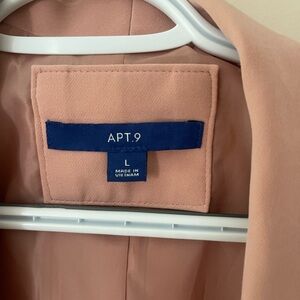 This Apt. 9 blazer in a soft pink hue features elegant shawl lapels and a textured fabric that adds sophistication to any outfit. The open-front design and three-quarter length sleeves make it a versatile piece for both casual and formal occasions.