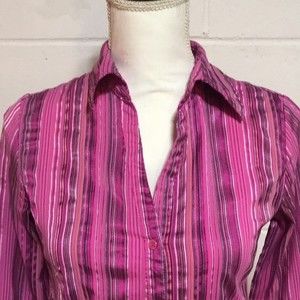 Pink stripe long sleeve button front blouse by Apt. 9. Size small. 3 buttons on sleeve cuff. Measures 17" across front - 16" long from armpit to hem - sleeve length 19" long from shoulder to sleeve hem. 62% polyester - 34% cotton - 4% spandex. In good condition. Comes from smoke free home.