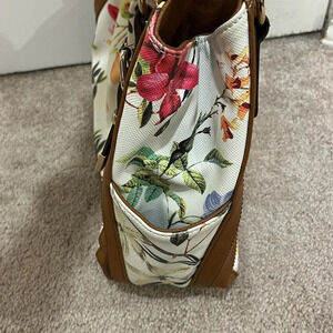 In great shape, hardly used! Front pocket with zipper and 2 side pockets! Inside has lots of room with multiple compartments and pockets! Cute pattern and strap design! Offers always welcome!
