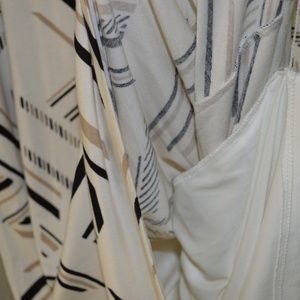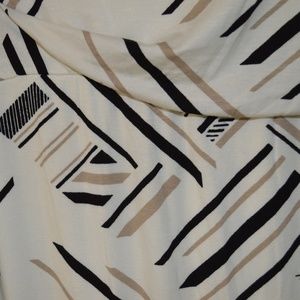 Cute dress with a blousen top, scoop neck, and elastic waist has a modern print. Super soft and stretchy , the dress is fully lined. Excellent pre loved condition.