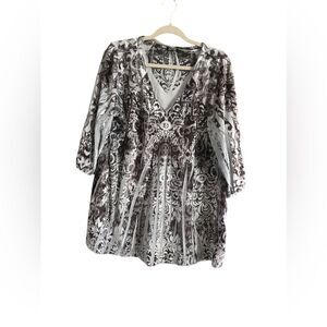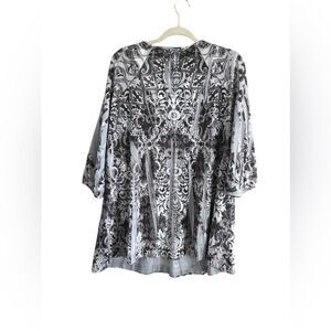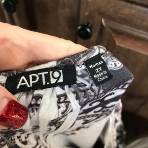 Apt 9 blouse in size 2X. Features a V-neck and quarter sleeves. Black and white color. Made of 90% polyester and 10% spandex. Thick material. Excellent condition with no issues. A147
