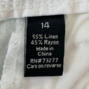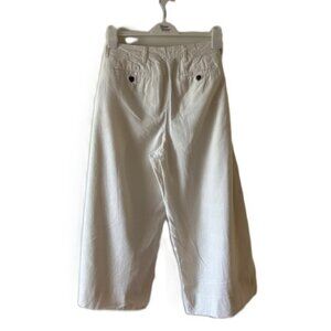 These cropped pants have front and back pockets and a front zipper/button enclosure. These pants measure 33 inches in length from the waist to the hem and measure 37 inches around the waist. These pants are in excellent, like-new condition without stains or flaws.