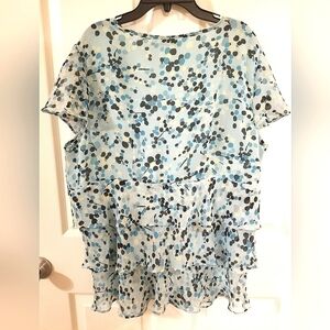 Beautiful Apt 9 Woman Top in blue polka dot print with tiered ruffles, super cute shiny black buttons accents, in great condition, washes well, size 1X.