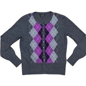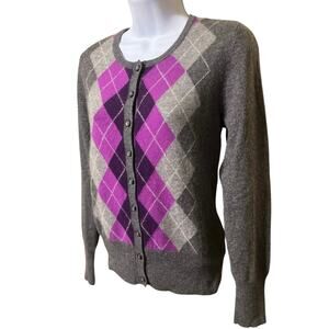 Apt 9 Women 100% Cashmere Cardigan M Purple Gray Argyle Diamond Button Preppy