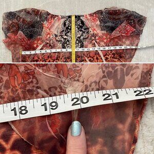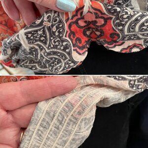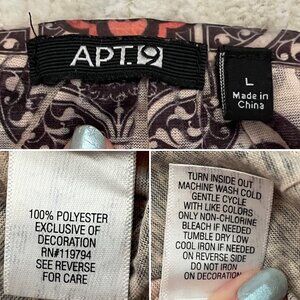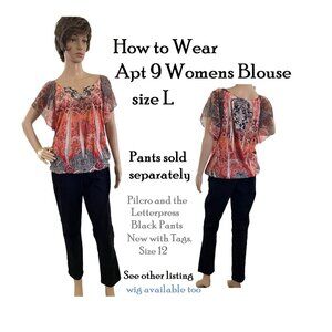 This Apt 9 blouse top is a delightful blend of style and elegance, featuring flutter short sleeves, a smocked waist, and beautiful paisley floral details in orange, black, and white. The size L is perfect for women who love a touch of femininity in their outfits.