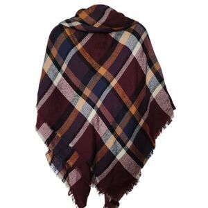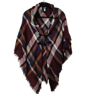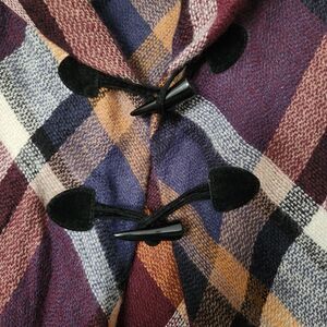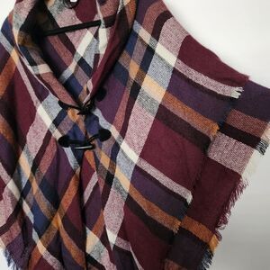 Stylish plaid poncho. Features a toggle closure. Perfect for layering.