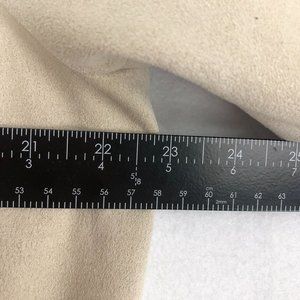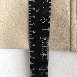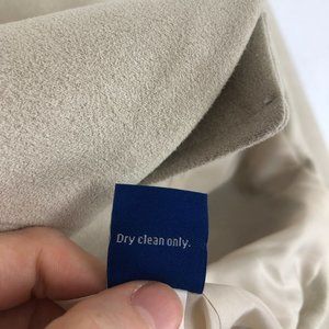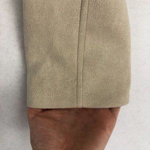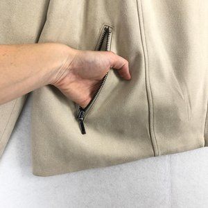 Women's beige cream faux suede long sleeve full zip jacket. Asymmetrical zipper front with button snap. Zippered hand pockets, long sleeves, lined.