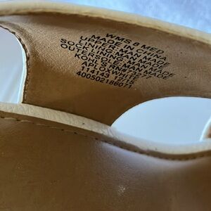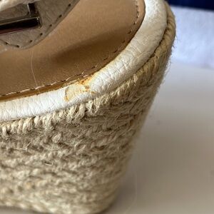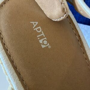 Apt 9 Women’s Sz 8M White 4” EspadrilleWedge Platform Open Toe Sling Back Heels. Sling back closure and adjustable straps-faux suede-synthetic insole material-synthetic upper and lining material-cross-band upper. Perfect for any occasion from weddings to workwear. Good preowned condition-there is a small defect on the left upper shoe (see picture).