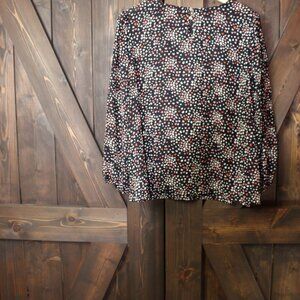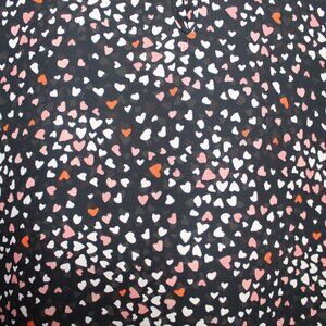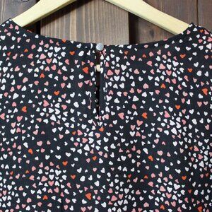 Description: Black with white, pink and red hearts blouse. Keyhole back. In excellent preloved condition