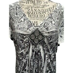 This Apt 9 Y2K blouse top in size 2X is a whimsical and colorful piece perfect for various occasions such as festivals, parties, or casual outings. The V-neckline, pullover closure, and short cap sleeves add to its comfortable and stylish design. The beaded accents and geometric pattern give it a unique and eye-catching look. Made from a blend of polyester and spandex, this tunic-style blouse is machine washable for easy care. With a blend of whimsical, Y2K, and gothic themes, this top is a standout addition to any woman's wardrobe.