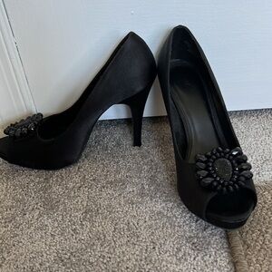 Apt 9 black heels with its front beaded design. The left black heel has peeled a little but not very noticeable