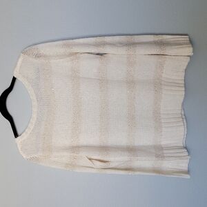 Cream with a slightly darker cream colored chunky stripe sweater. Has random sequins all over. Metallic gold thread throughout as well. Ribbed cuffs and bottom. somewhat of an open knit look. Excellent condition. Crochet look.
