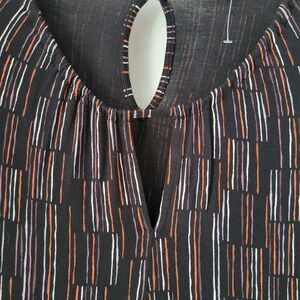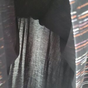 It's so pretty! It's soft and comfortable, with some stretch. The background is black, and the vertical stripe design is in white, red, rust, and lavender. It works!!