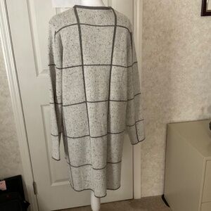Beautiful and warm sweater jacket which you can wear with slacks or dresses. Grey square pattern with 2 patch pockets on front. Measures 33 1/2” long from Knapp of neck to bottom hem. Very good condition.