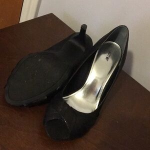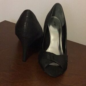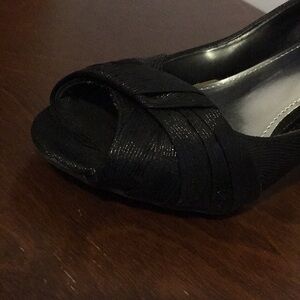 These black peep toe heels are a metallic black pattern. There is a twist on the front of the peep toe portion.