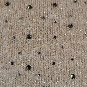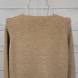 Super soft and slightly fuzzy pullover camel tan sweater by Apt. 9 with bronze embellishments around the neckline, long sleeves, and a ribbed knit hemline and cuffs. Great pre-owned condition.