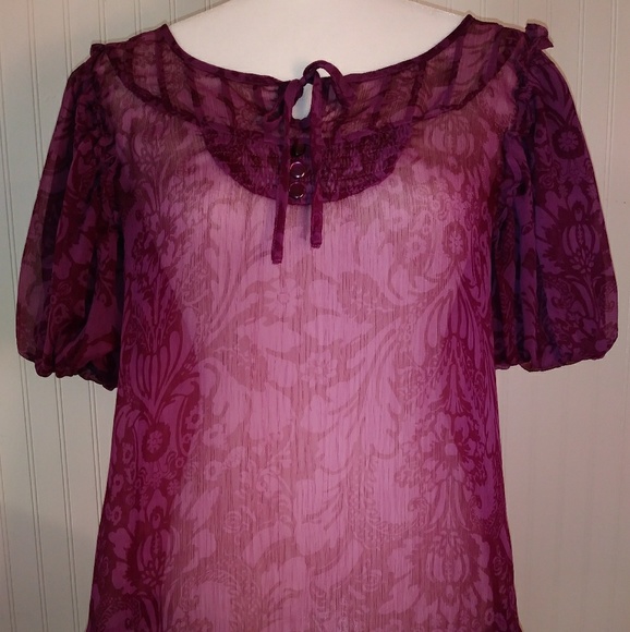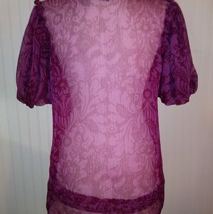 Very nice sheer blouse with elastic puff sleeves.Very cute detail on front. Looks great with a pair of ankle jeans. No flaws.