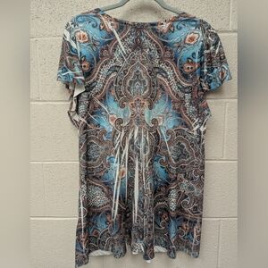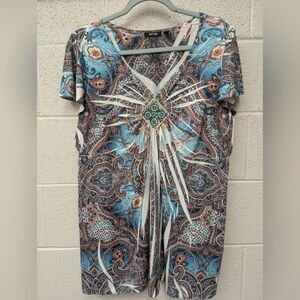 A beautiful plus sized top with jeweled center detail, short sleeves, and an a-line waist. There is a seam at the ribcage that form the a-line look. This is in excellent condition and comes from a smoke-free home.