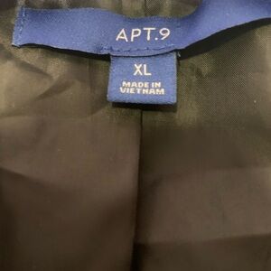 APT 9 Size XL tweed Moto jacket. Jacket is blue, black,white, gray metallic detailing, with purpleish tones. Has hidden zipper with button on the top as well on the bottom button sleeves, Fully lined, with fringe detailing. Sleeve measures from the shoulder approximately 25 inches and total length of the jacket is about 24 inches., and across chest 23 inches from pit to pit. Good preowned condition no tears noted.