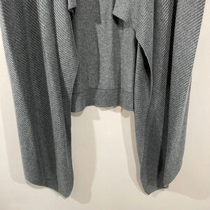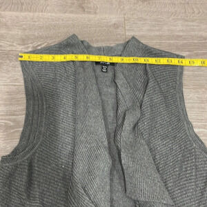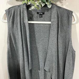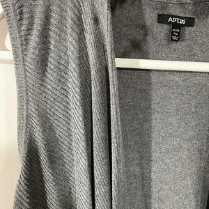 Apt. 9 sleeveless open front gray cardigan in size PM. Great preowned condition, care tag was removed fabric is 40% rayon, 40% polyester and 20% cotton. Drape front style is longer in the front. Please see photos for approximate measurements and details. Item may show a difference in color based upon photography and perception. Photos are part of the description, as everyone’s level of condition may vary. From smoke free and pet free home. All packages are shipped the same or next business day.