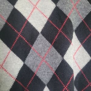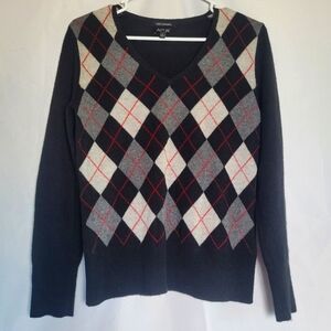 Apt. 9 100% Cashmere Black with Gray and Red Argyle Front Vneck Sweater. Women's size medium. Does have a small hole near hem. See all photos for measurements and picture of hole.