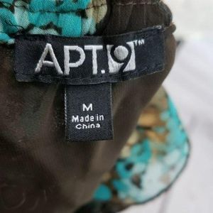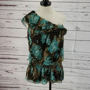 Apt.9 Floral one shoulder blouse Size medium. 100% polyester. Dark brown background with blue and brown dotted design. Elastic at waist. Ruffled at top.