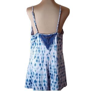 White, lavender and blue tie dyed fabric Triangular dark blue lace inserts in front and back