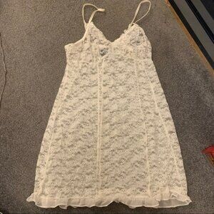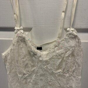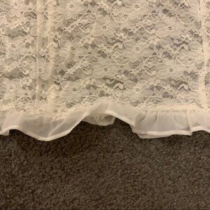Creamy white lace with embroidered neckline detail and bottom ruffle. See through. Size medium. Like new. Has stretch.