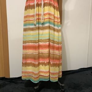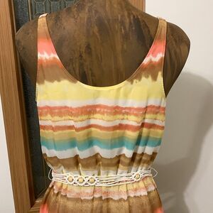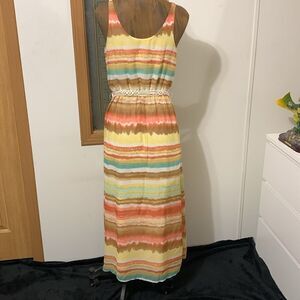 maxi dress, sleeveless dress, multicolor, rainbow, yellow, mustard, orange, coral, teal, turquoise, brown, beige, striped, watercolor print, bohemian pattern, cotton blend, lightweight fabric, flowy material, relaxed fit, cinched waist, braided rope belt, casual chic, summer outing, beachwear, vacation style, spring summer fashion, laid-back elegance, effortless, trendy, stylish, boho-inspired, free-spirited, comfortable, breezy