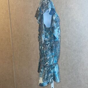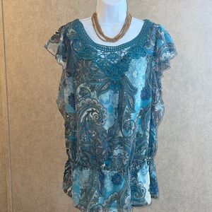 Such a pretty turquoise blouse. Has beautiful detailing around the neck. Pit 20”. Length 28”