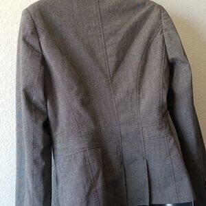 This beautiful grey blazer has 2 buttons on the front and 4 on the wrists (wrist buttons are decorative). The inner lining is black, and note a small white mark near the inner lining in photo 8.