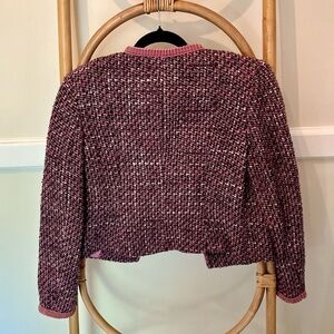 This boucle tweed blazer, which fastens with front hooks, is giving iconic Parisian vibes. The sweet dusty rose pleated velvet detailing is begging to be paired with something more edgy on bottom or keep it realtor and do a nice black pencil skirt. It’s giving Charlie XCX on SNL.