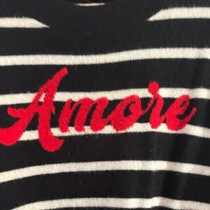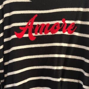 Chic black and white stripes. Bold red 'Amore' accent. Perfect for casual elegance. Phasing out summer into Fall! Going to be sweater weather before we know it! This is a good one. Brand is Bloomingdale's Aqua! I religiously buy at least 5 sweaters per season. They are a great value and always really cute! This one has only been worn a couple times!