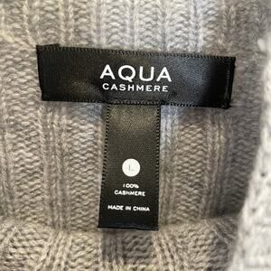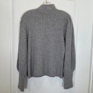 Gray balloon sleeve, snug-fit 100% cashmere pullover sweater by Aqua, from Bloomingdale's. Ribbed texture, mock neckline. Excellent pre-owned condition. Bust across the front area measures approx. 18 inches.