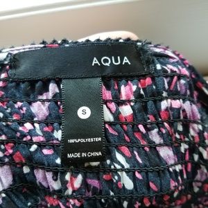 Very flattering Aqua dress in purple and pink patter with a rushed stretchy top in a size small. Machine washable and great for the office. This dress has been worn but has no visible signs of wear. I am 5' 2" and this hits just above my knees, very office friendly.