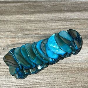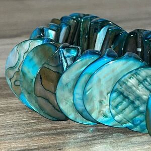 Aqua Blue Abalone Shell Bracelet Stretch Round Statement Iridescent Beach Coast