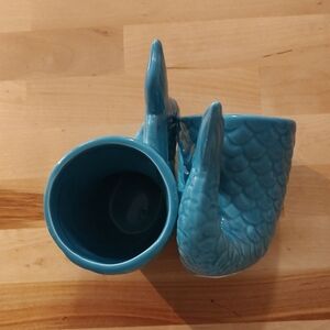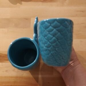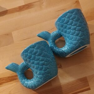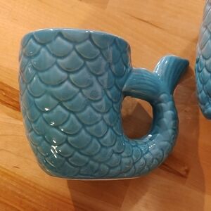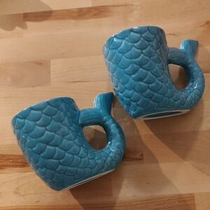 Set of two blue aqua 8 oz mugs with mermaid tail handles. 4" tall. Perfect for ocean lovers.