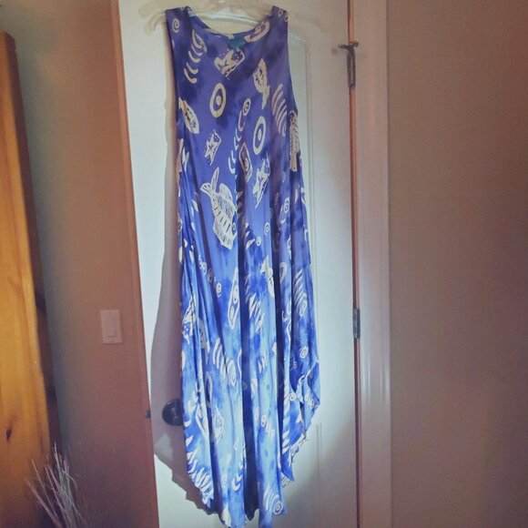 Beautiful sundress in aqua blue with fish motif and handkerchief hem. 100% Rayon. p2p 21", length at back center 50"