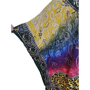 The Aqua Blue Hippie Boho Caftan Top in Plus Size 1X is a stylish and comfortable choice for casual occasions. Made of lightweight rayon fabric, this tunic-style top features a V-neckline, pullover closure, and embellished studded accents. The tie-dye pattern and kimono sleeves give it a festival-ready bohemian vibe, perfect for summer and spring. Hand wash only to maintain its quality, this multicolor blouse from Aqua Blue is a must-have for women looking for a relaxed fit with a hippie, bohemian theme. CLOTHING AND FABRIC ITEMS: All clothing and fabric items have been steam cleaned and/or washed.