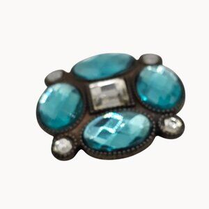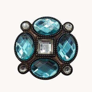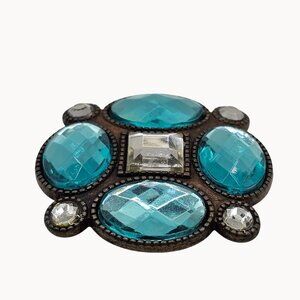 Aqua Blue Oval Rhinestone Bronze Tone Round Faceted Brooch Pin Fairycore Cottage